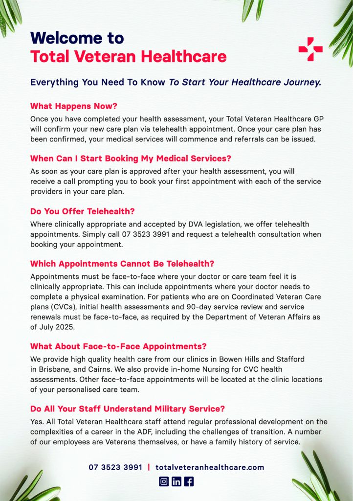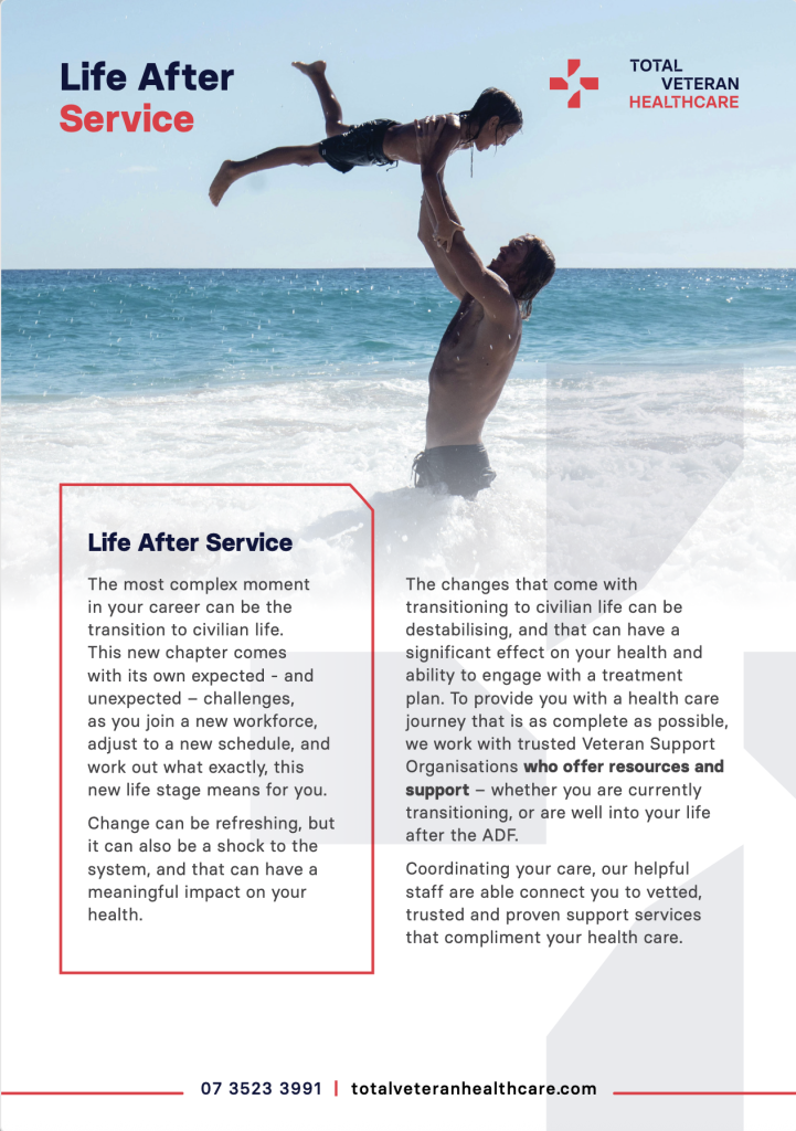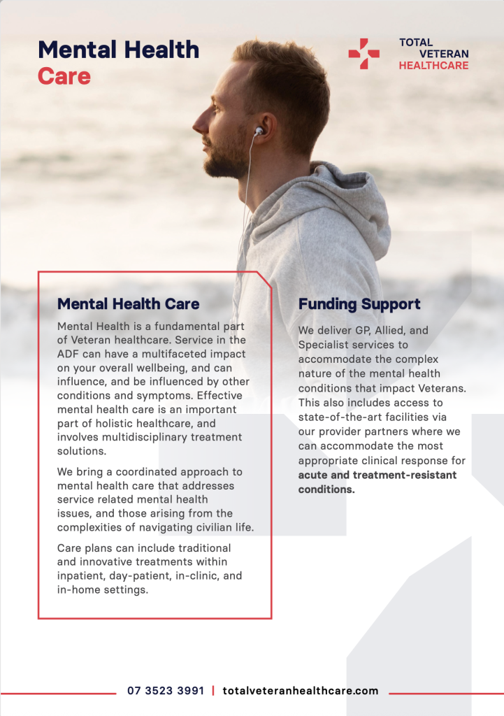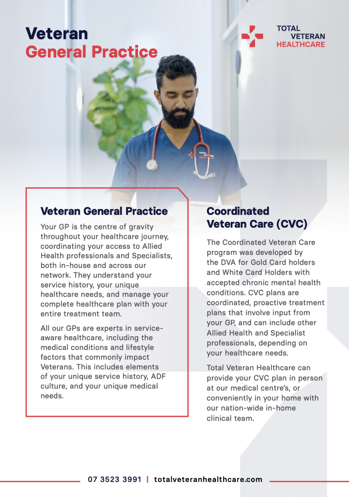 Resources Practical tools and information for better health outcomes. Start your journey Home » Resources Services and Support ANZAC Day Guide To Services and Support 2026 FAQ Flyer Business Profile 2026 Specialty Flyers Life After Service Mental Health Care Pain Management Veteran General Practice Service Flyers Coordinated Veteran Care Plans (CVC) Psychology Medico-Legal (GP & Psychiatry Reports) Innovative Treatments Inpatient Treatment Psychiatry Transcranial Magnetic Stimulation (TMS)