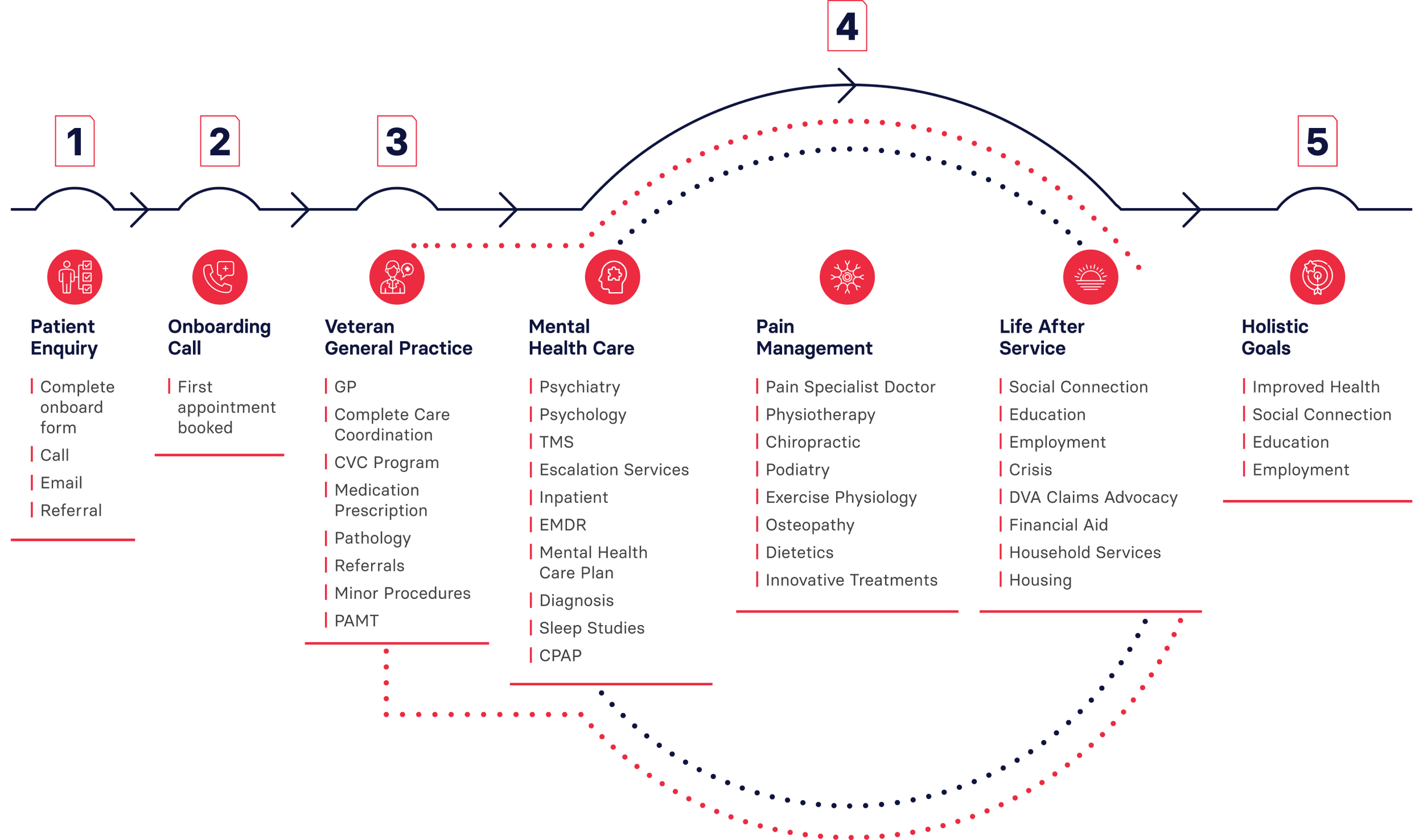 Your GP is the centre of gravity throughout your healthcare journey, coordinating your access to allied heaalth professionals and specialists, both in- house and across our network. They understand your service history, your unique healthcare needs, and manage your complete healthcare plan with your entire treatment team.